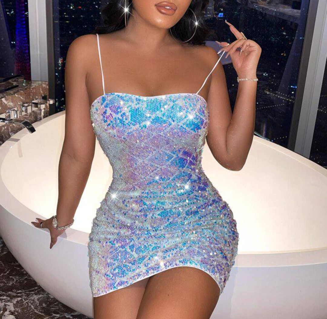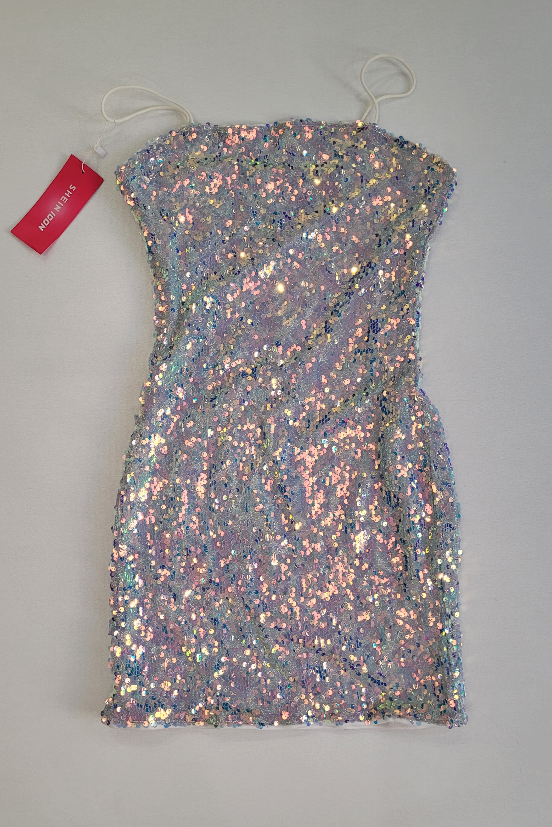 پیراهن مجلسی پولکی رنگ پری دریایی کوتاه بالای زانو برند شین سایز اسمال کشسانی دارد و مناسب سایز ۳۴ و ۳۶ تنخور عالی مناسب مجالس و مهمانی ها