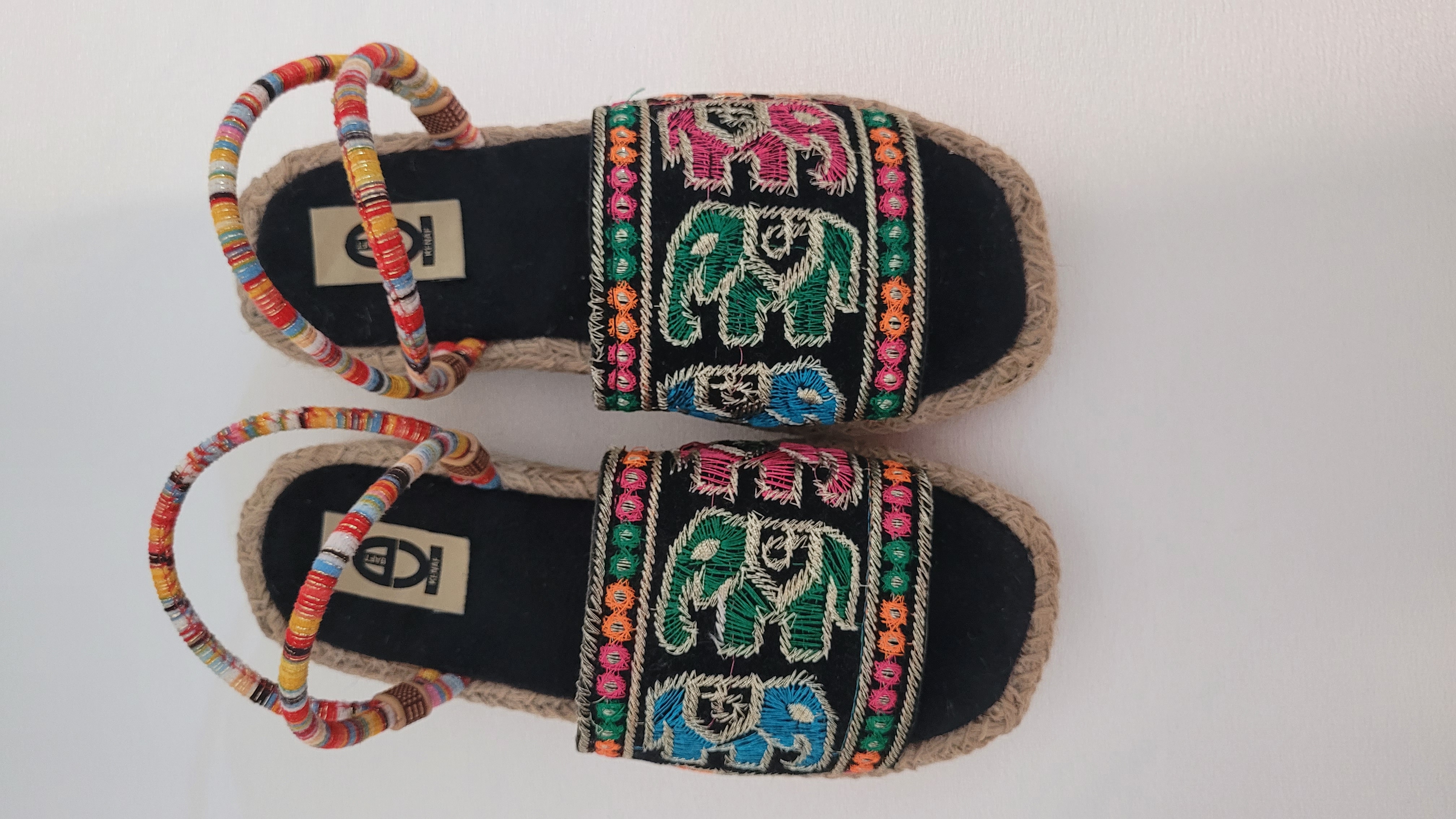 صندل سنتی کنفی دستدوز سوزندوزی طرح فیل لژ ۵سانت زیره پیو بسیار سبک و راحت دارای بند قابل تنظیم و نرم مناسب کافه گردی پاساژ گردی مسافرت گردشگری بومگردی و کویر و ساحل و استایل های سبک بوهو و تابستانی