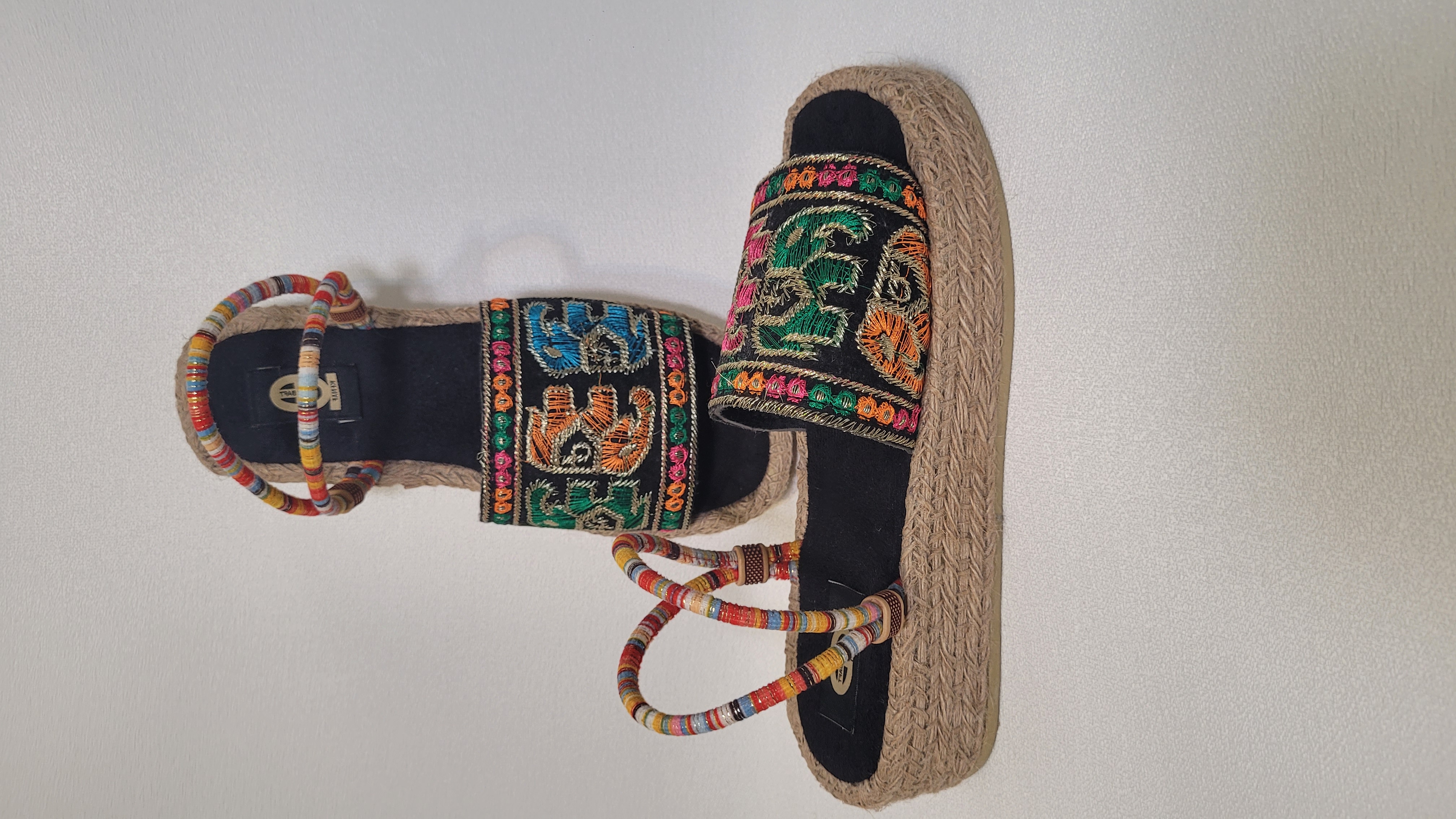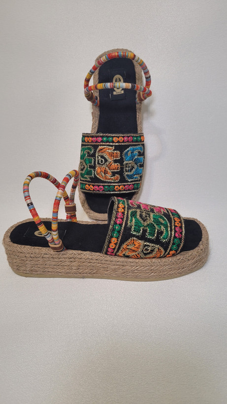 صندل سنتی کنفی دستدوز سوزندوزی طرح فیل لژ ۵سانت زیره پیو بسیار سبک و راحت دارای بند قابل تنظیم و نرم مناسب کافه گردی پاساژ گردی مسافرت گردشگری بومگردی و کویر و ساحل و استایل های سبک بوهو و تابستانی