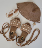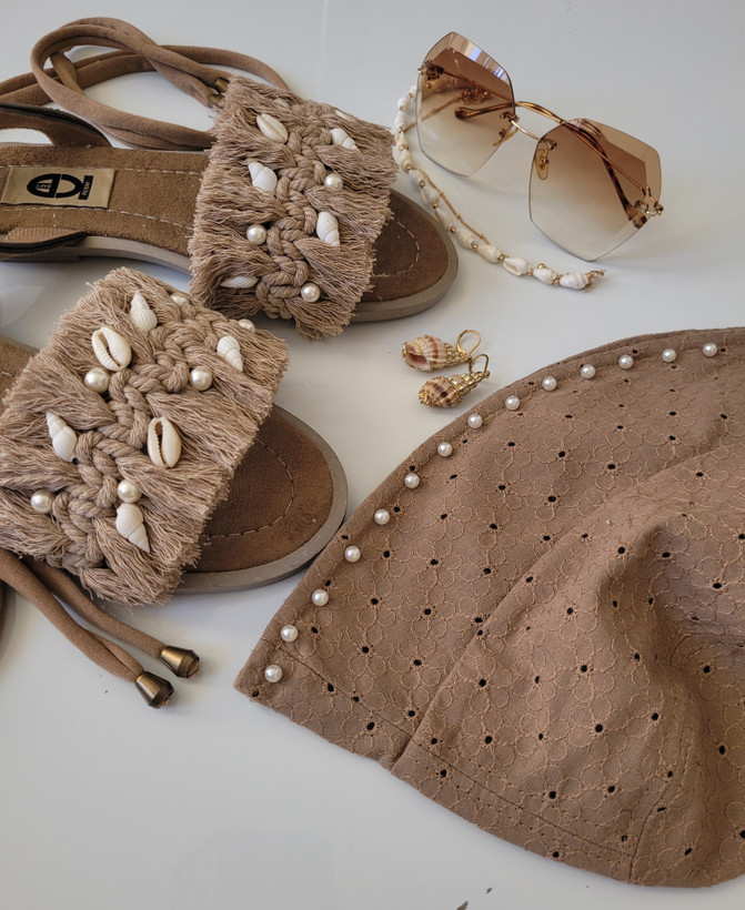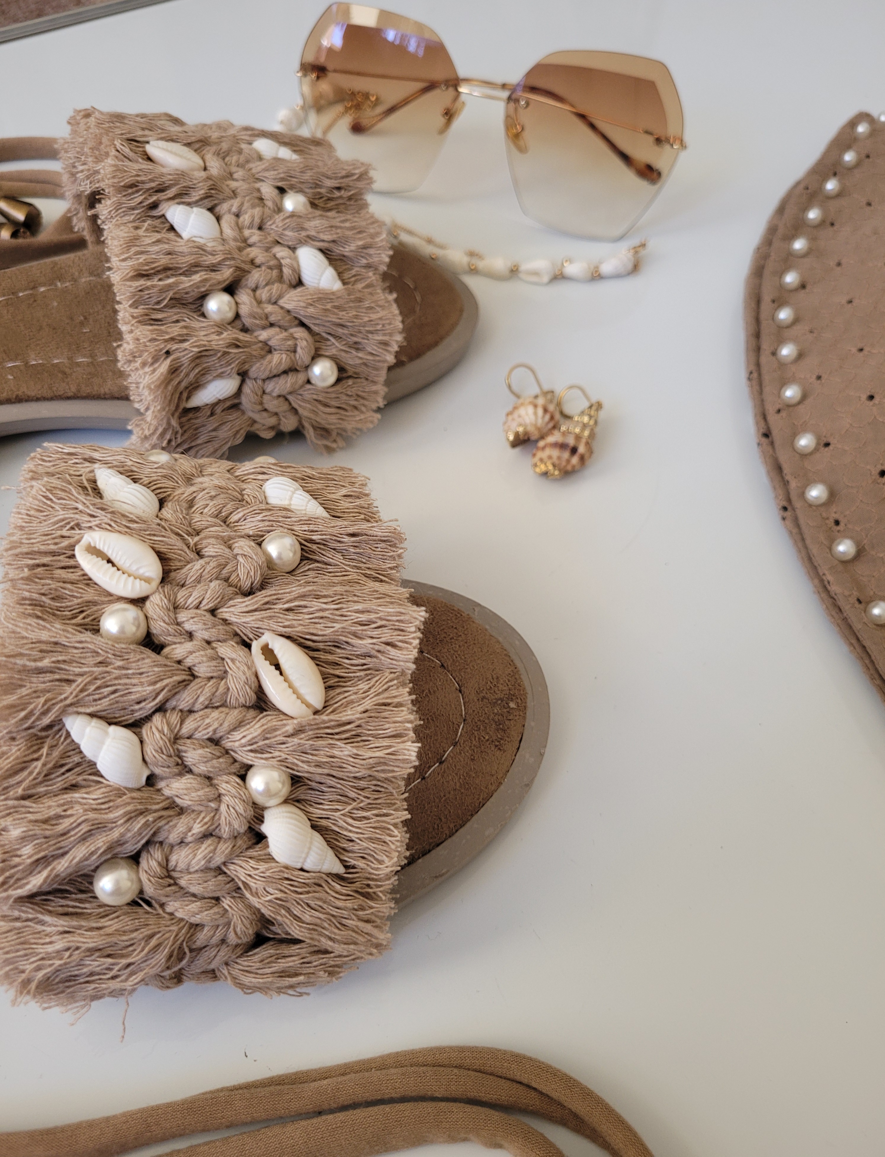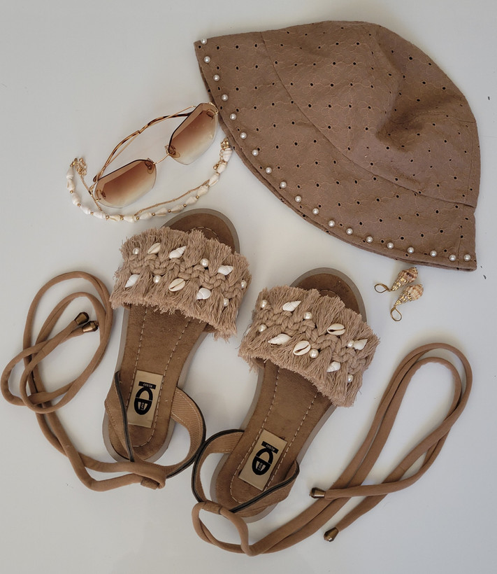صندل صدف مروارید دستدوز جنس سوییت درجه یک و نرم و راحت در پا بند بلند استریج تا بالا زانو هم قابل تنظیم است.مناسب استایلهای خاص تابستانی ساحلی و سفرهای توریستی و کافه گردی بومگردی